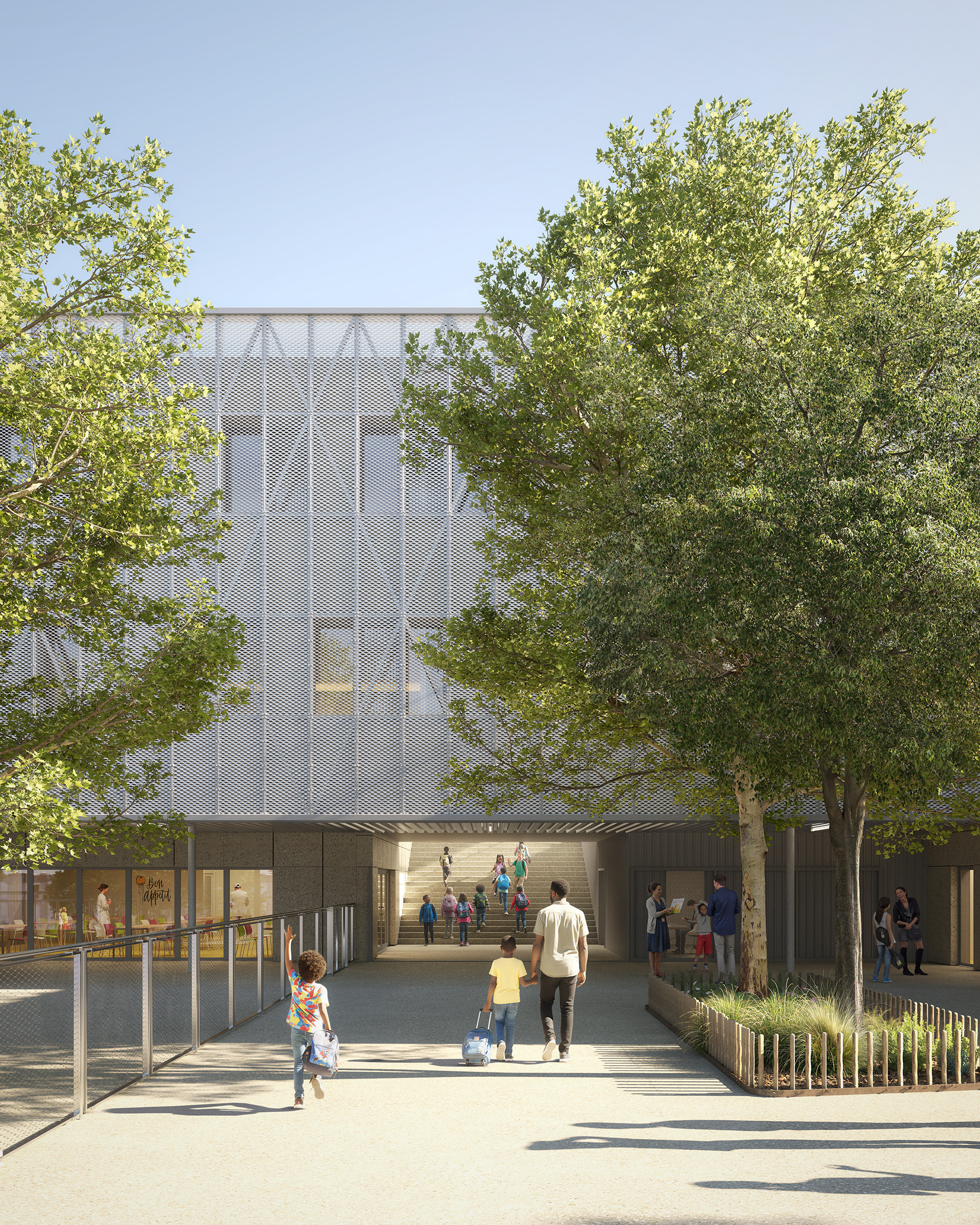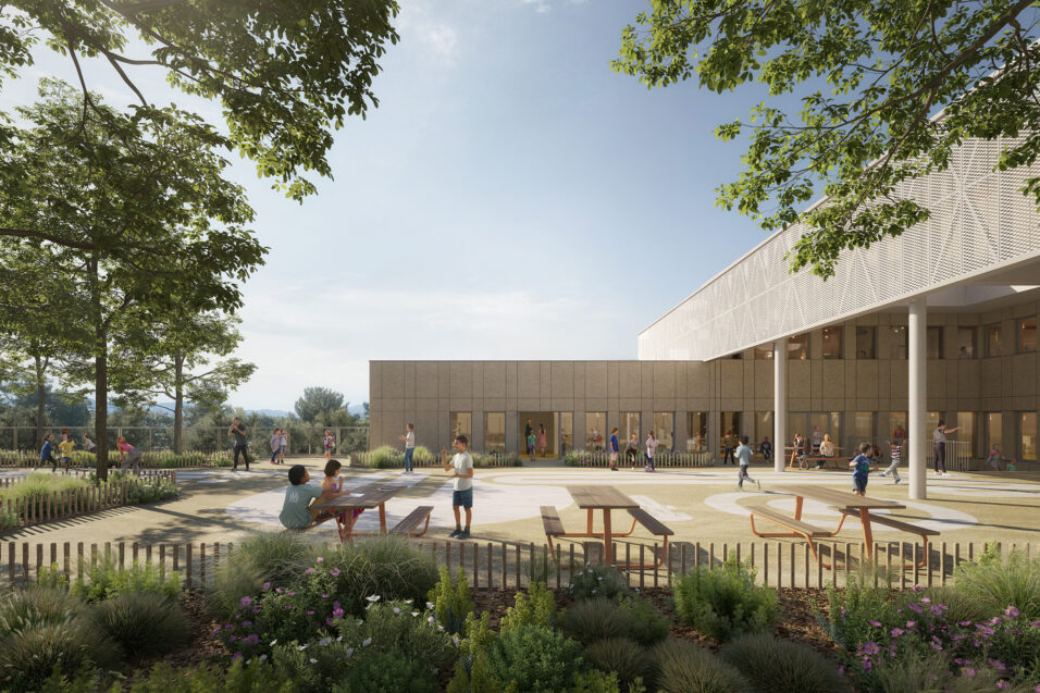 Image du concours d'architecture de la cours d'école du groupe scolaire de Vallon-Régny, arborée et de son préau ombragé
